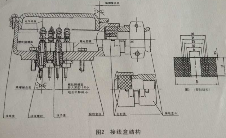 B、隔爆接合面的長(zhǎng)度間隙、表面粗糙度、結(jié)線盒內(nèi)部裸露導(dǎo)體之間、裸露導(dǎo)體與金屬外殼之間的電氣間隙及爬電距離見下圖1,2。