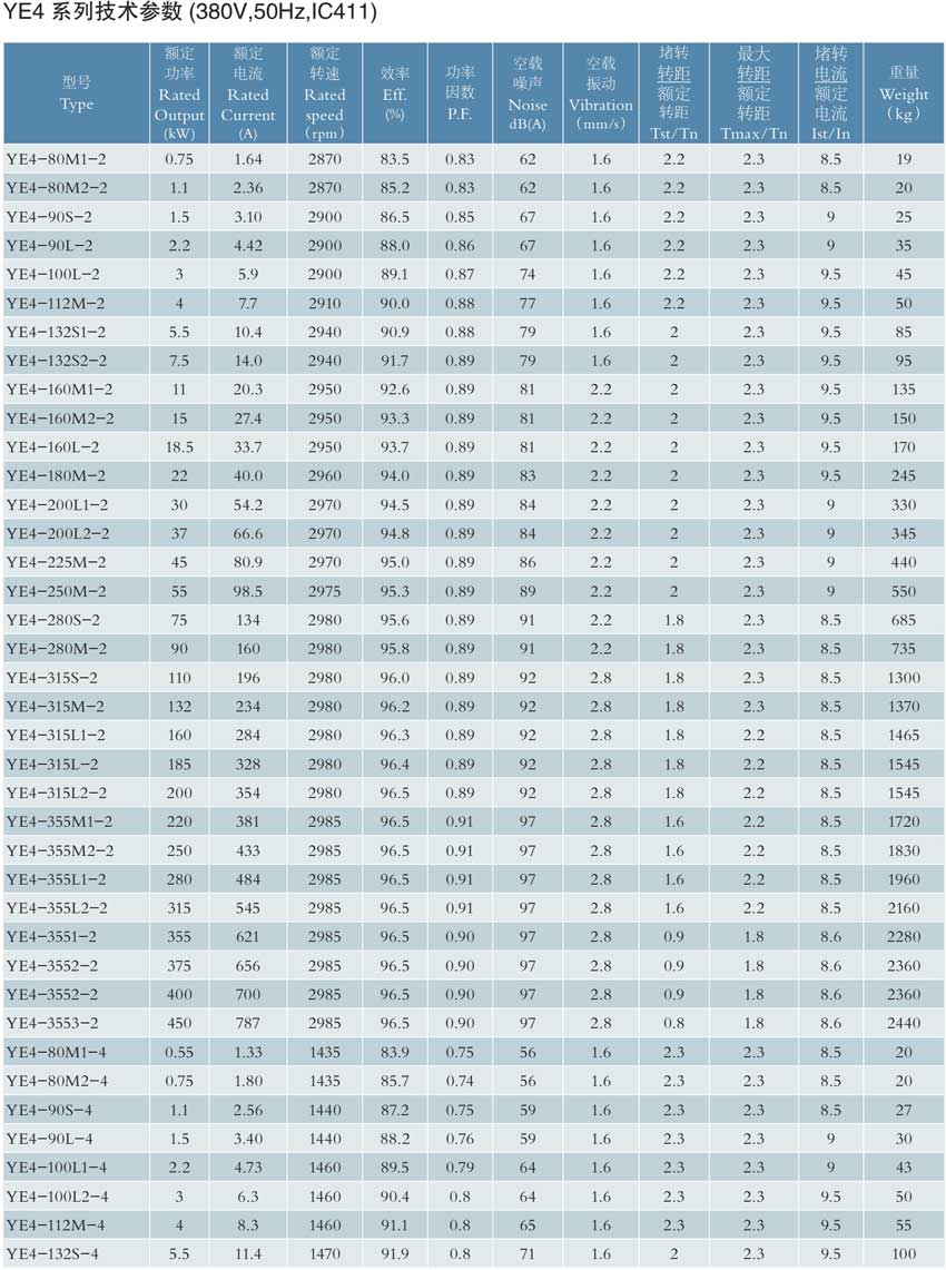 YE4系列電機(jī)部分技術(shù)參數(shù)