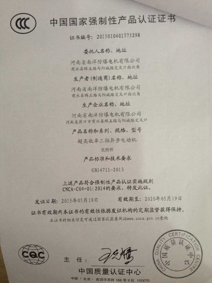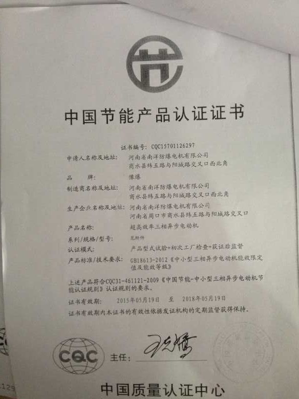 在2015年5月19日的這一天,對于河南省南洋防爆電機(jī)有限公司來說是值得慶祝的一天。因?yàn)榫驮谶@一天公司獲得了YE3系列超高效率隔爆型電動機(jī)的雙重產(chǎn)品認(rèn)證證書。也就是說在這一天河南省南洋防爆電機(jī)有限公司可以投入YE3超高效率隔爆型電動機(jī)的生產(chǎn)了。至此普天同慶的時刻,河南省南洋防爆電機(jī)有限公司董事長王科偉先生代表公司對做出這一貢獻(xiàn)的廣大同仁表示慰問和感謝。