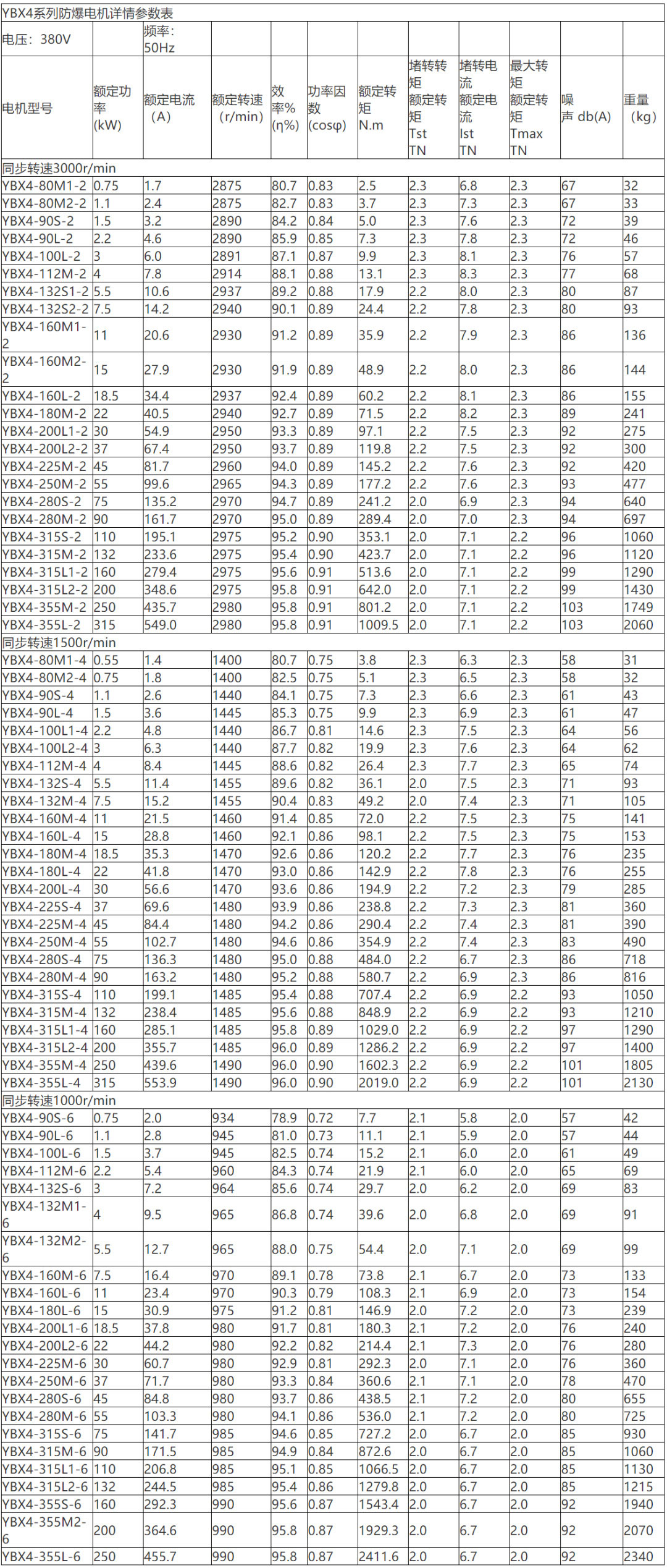YBX4防爆電機(jī)參數(shù)表